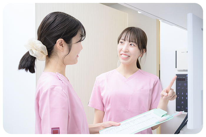 新しい職場に不安はつきものですが、当院ではクリニック全体でしっかりサポートしますのでご安心ください。研修や教育はすべて勤務時間内に行い、無理なく業務に慣れていただける体制を整えています。新しい環境で楽しく働けるよう、一歩ずつ丁寧に支えていきます。